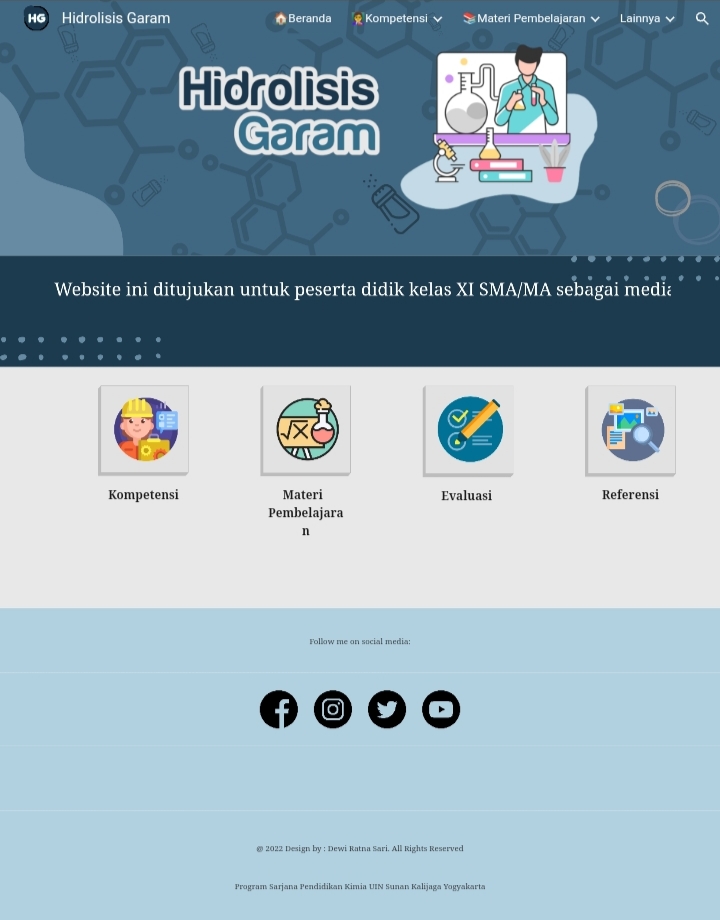 Media pembelajaran kimia google sites berbasis pendekatan contextual teaching and learning (CTL) pada materi hidrolisis garam merupakan suatu media pembelajaran yang didalamnya berisikan halaman beranda, kompetensi, materi pembelajaran, evaluasi, dan referensi. Materi pembelajaran google sites dilengkapi dengan materi hidrolisis garam yang memuat komponen-komponen pendekatan contextual teaching and learning (CTL) pada setiap sub materinya. Media pembelajaran google sites dapat di akses dengan mudah kapanpun dan dimanapun dengan adanya jaringan internet.